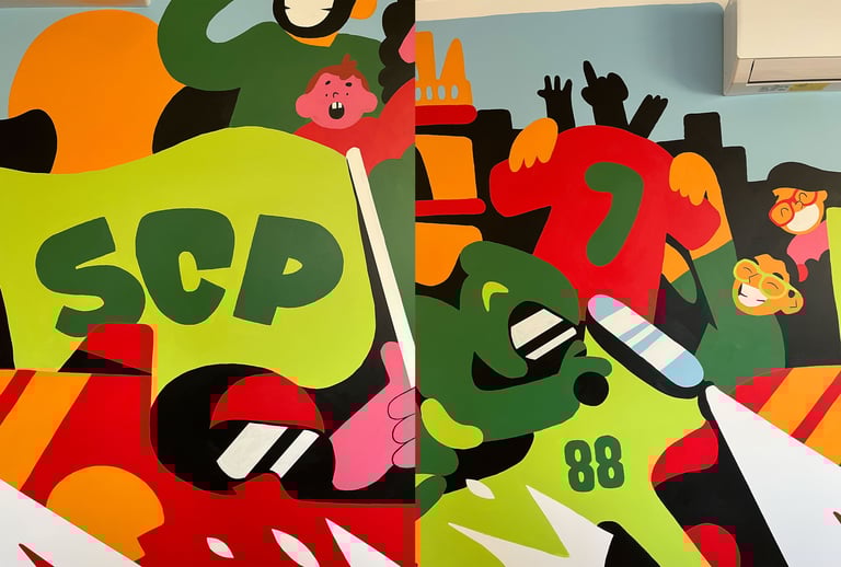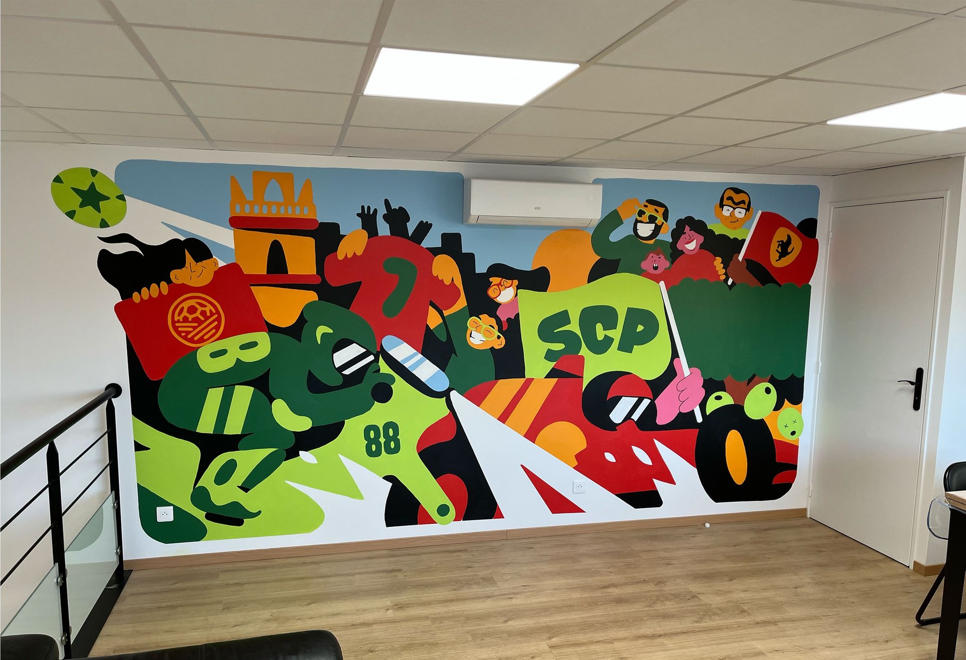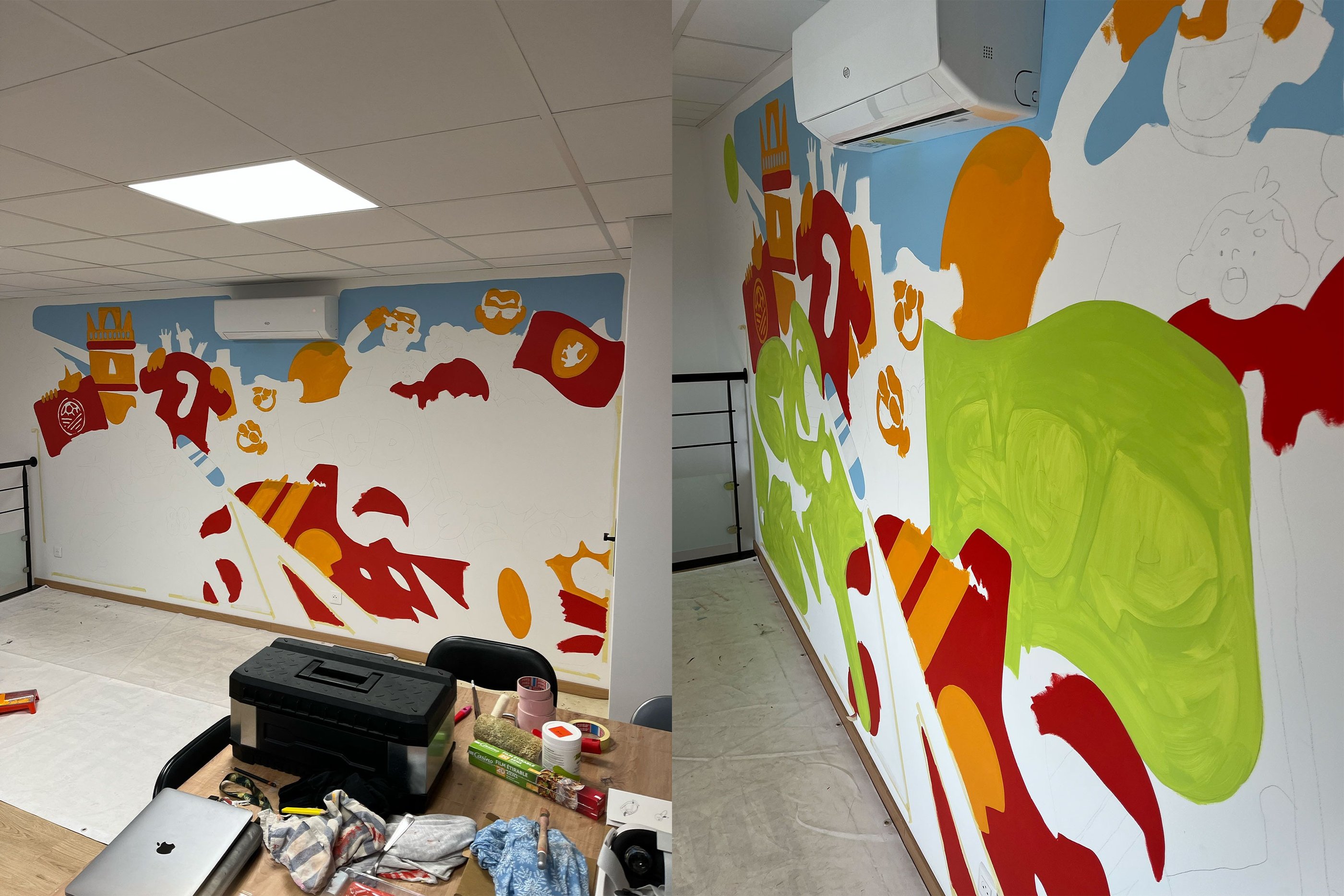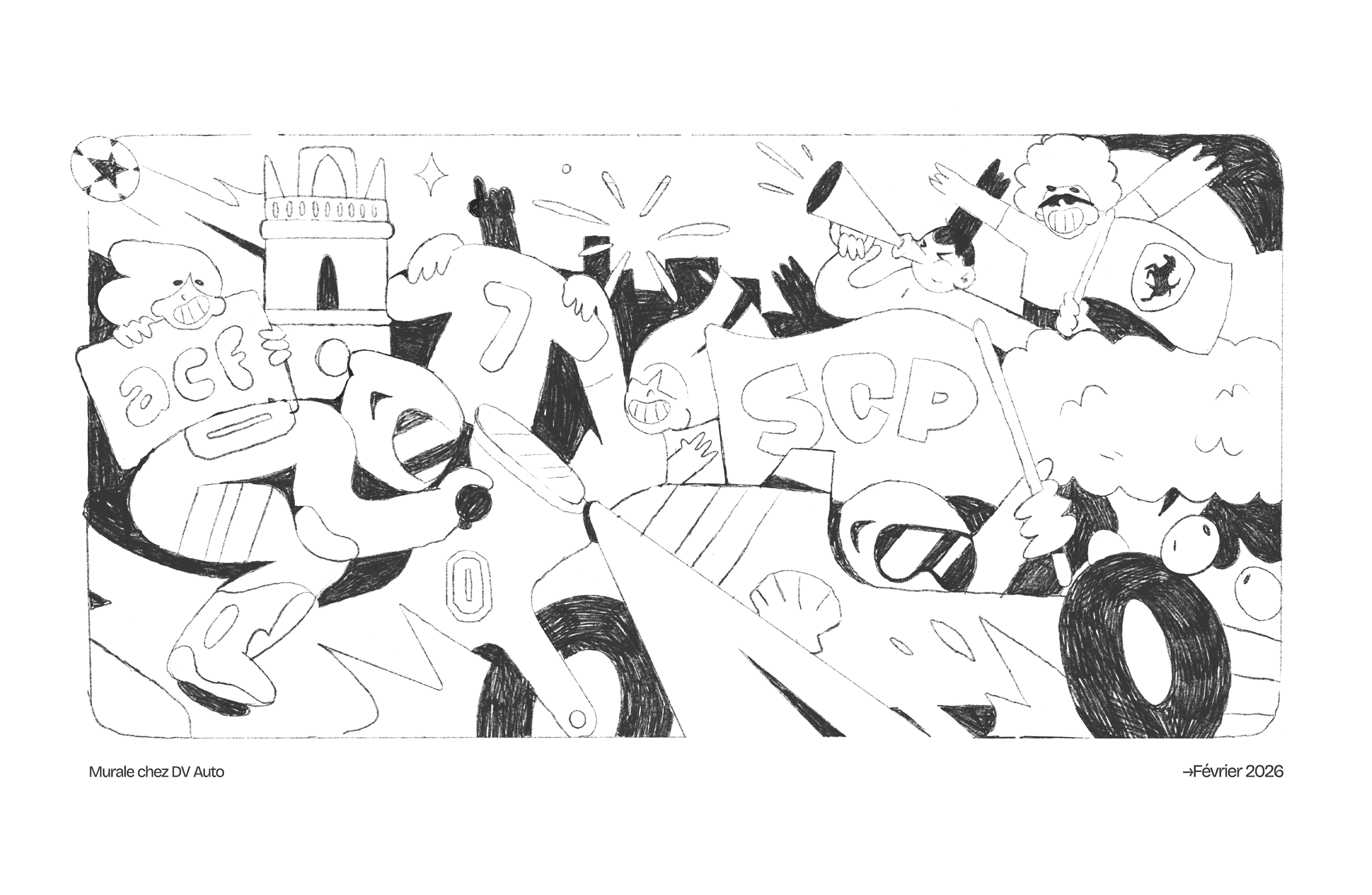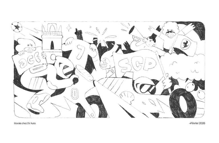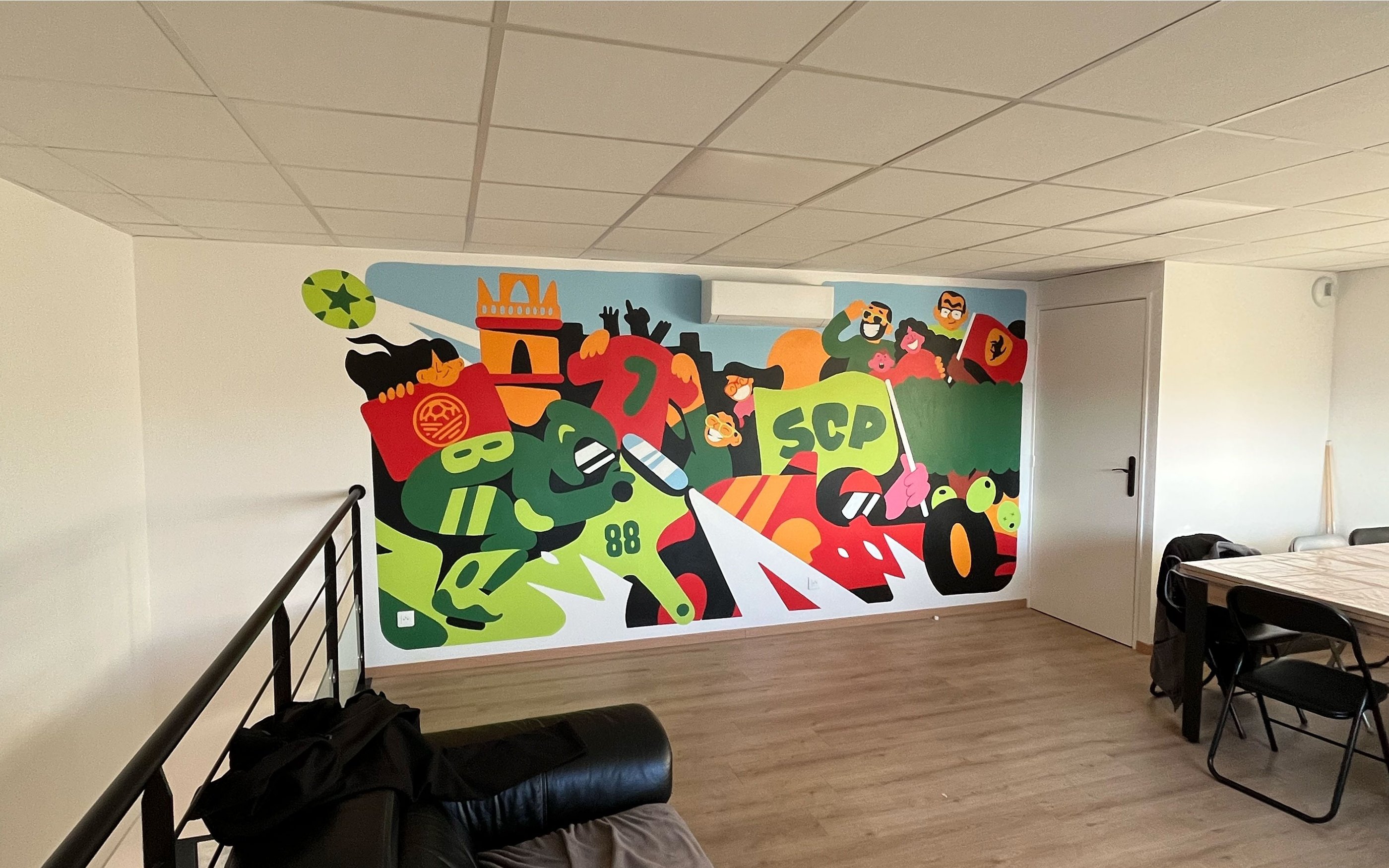 J'ai eu le plaisir de réaliser une nouvelle murale chez les copains du contrôle technique de Renaison. Celle ci se trouve dans la salle des employés, l'occasion pour moi d'illustrer plus de références personnelles de Romain.