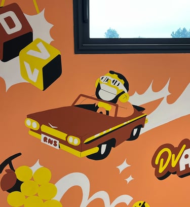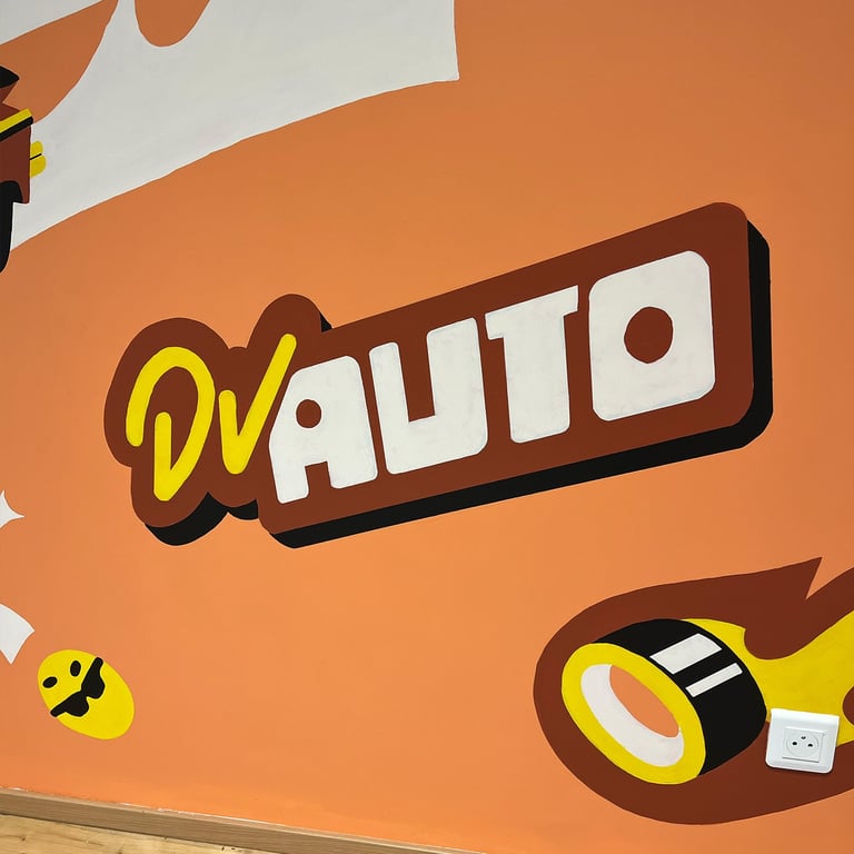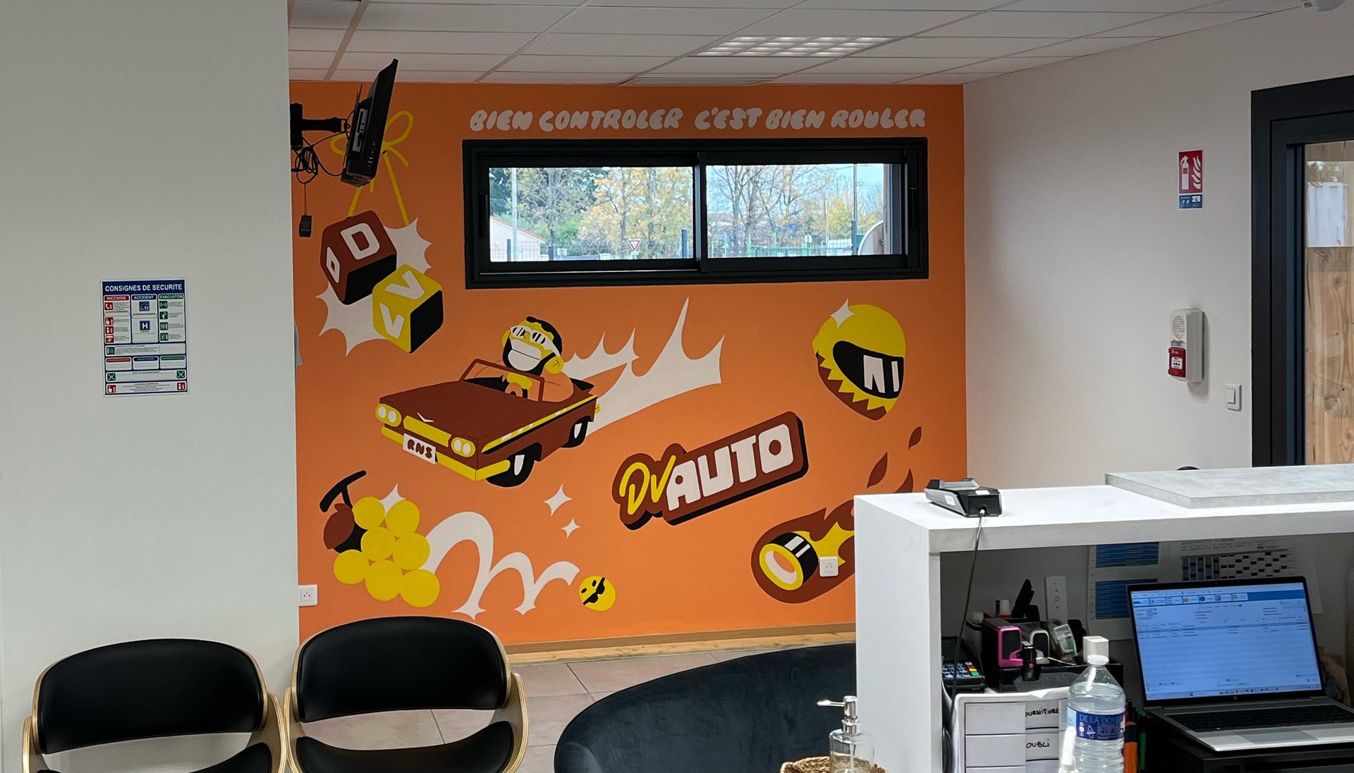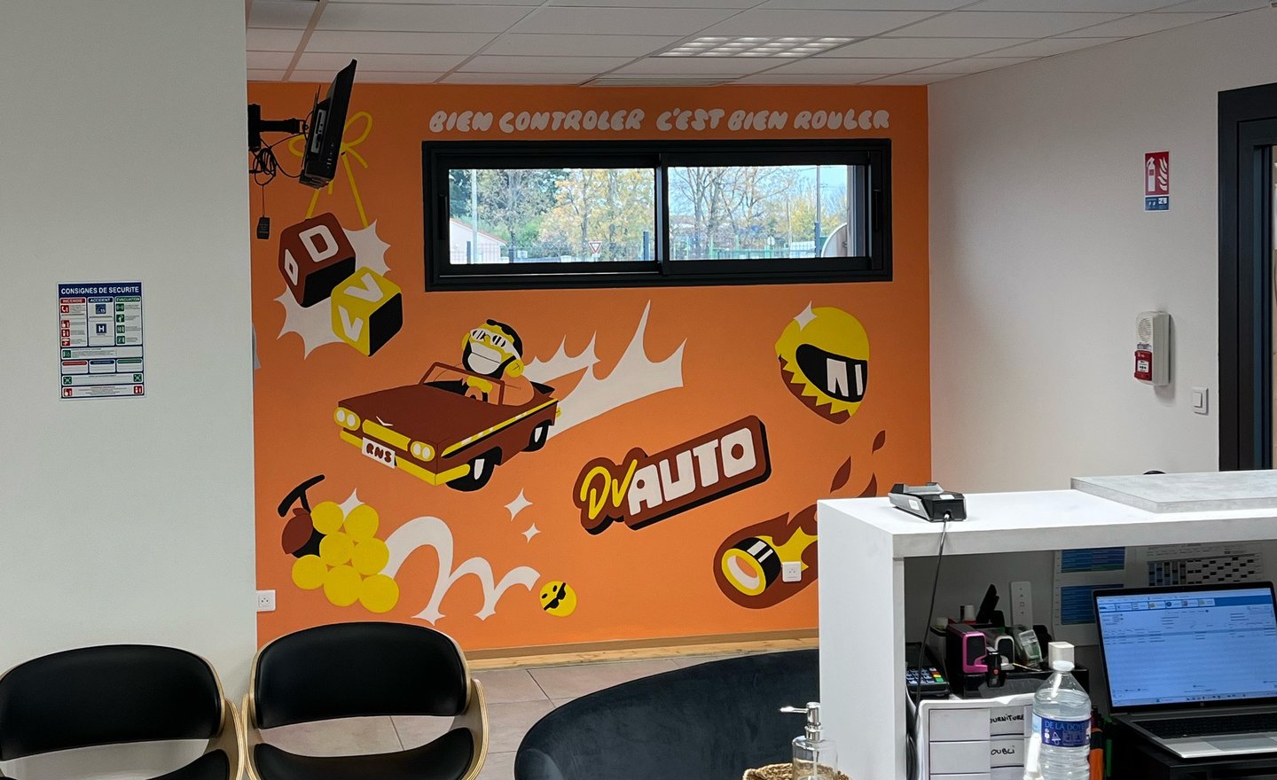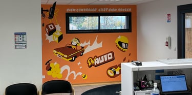J'ai eu le plaisir de pouvoir passer une semaine chez DV Auto, un établissement de contrôle technique de ma région, pour peindre le mur de sa salle d'attente. C'était l'occasion d'amener de la couleur et plus de vie dans ce nouveau bâtiment.